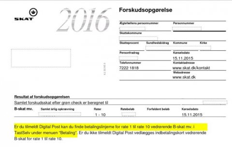 Her kan du se et eksempel på teksten fra SKAT, hvoraf du kan se, hvordan du skal betale B-skat for 2016. Du skal med andre ord være meget opmærksom, hvis du har tilmeldt dig digital post. Læs det med gult ovenfor.